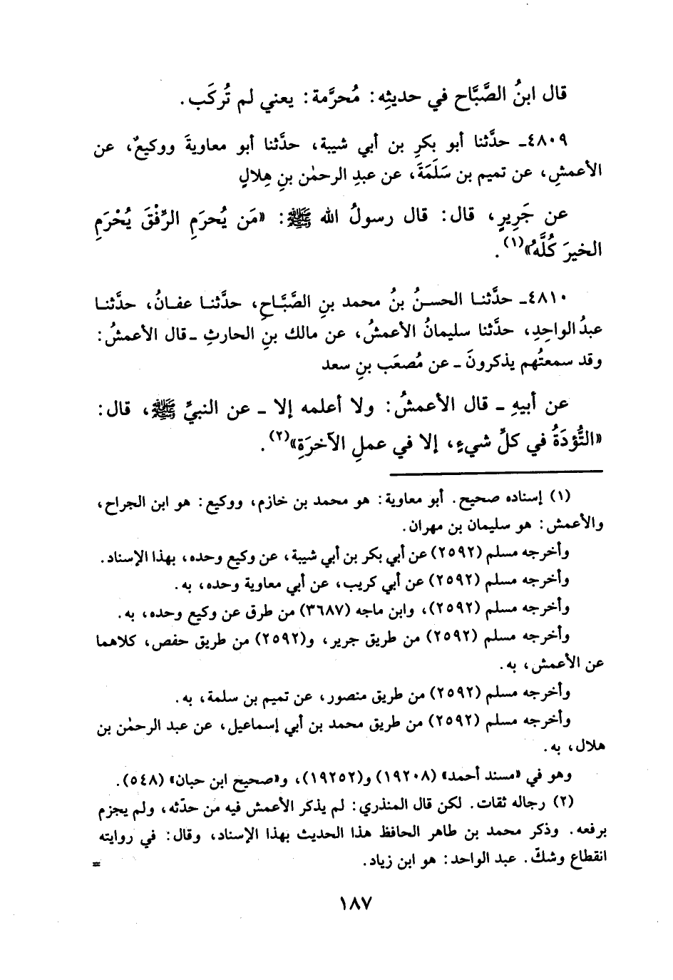 (¬١) إسناده صحيح. أبو معاوية: هو محمَّد بن خازم، ووكيع: هو ابن الجراح، والأعمش: هو سليمان بن مهران.