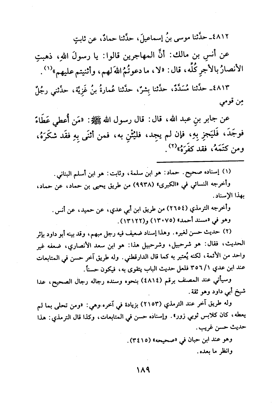 عن جابر بنِ عبد الله، قال: قال رسول الله -صلى الله عليه وسلم-: "مَن أعطي عَطَاءً فوجَدَ، فَليَجزِ بِهِ، فان لم يجِد، فليثنِ به، فمن أثنَى بهِ فقَد شكَرَهُ، ومن كتَمَهُ، فقد كفَرَهُ" (¬٢).