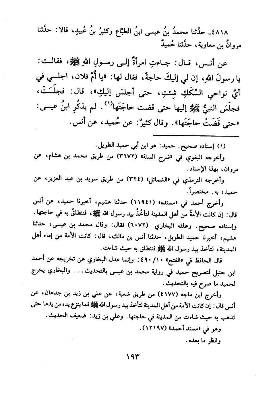 وإسناده صحيح. وعلقه البخاري (٦٠٧٢) فقال: وقال محمَّد بن عيسى، حدَّثنا هشيم، أخبرنا حميد الطويل، حدَّثنا أنس بن مالك، قال: كانت الأمة من إماء أهل المدينة، لتأخذ بيد رسول الله -صلى الله عليه وسلم- فتنطلق به حيث شاءت.