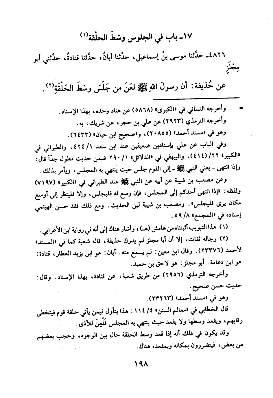 ١٧ - باب في الجلوس وسْطَ الحلْقة (¬١)