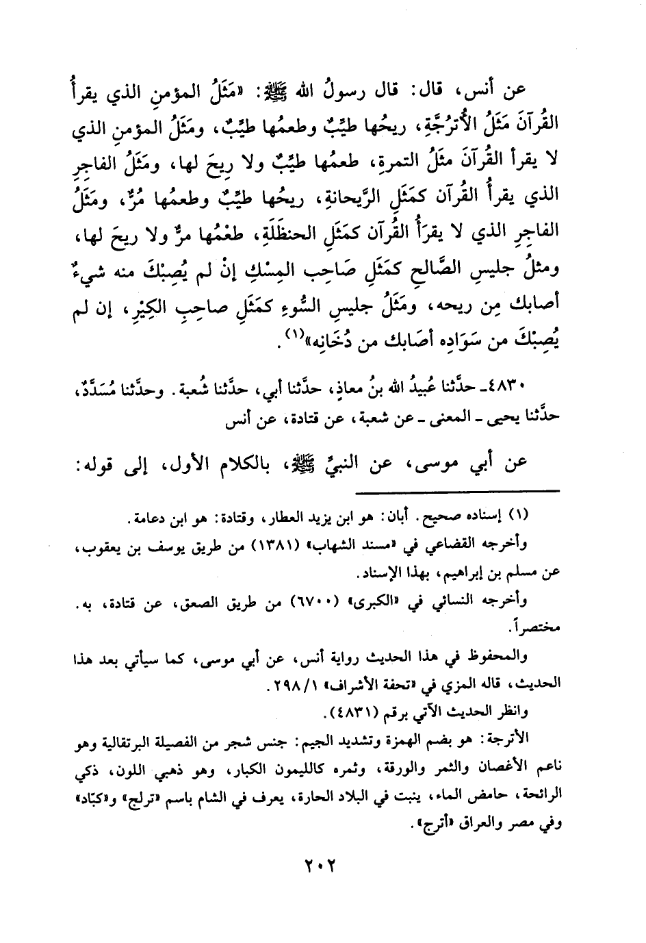 عن أنس، قال: قال رسولُ الله -صلى الله عليه وسلم-: "مَثَلُ المؤمنِ الذي يقرأُ القُرآنَ مَثَلُ الأُترُجَّةِ، ريحُها طيِّبُ وطعمُها طيِّبُ، ومَثَلُ المؤمنِ الذي لا يقرأ القُرآنَ مثَلُ التمرةِ، طعمُها طيِّبُ ولا رِيحَ لها، ومَثَلُ الفاجِرِ الذي يقرأُ القُرآن كمَثَلِ الرَّيحانةِ، ريحُها طيِّبٌ وطعمُها مُرٌّ، ومَثَلُ الفاجِرِ الذي لا يقرَأُ القُرآن كمَثَلِ الحنظَلَةِ، طعْمُها مرُّ ولا ريحَ لها، ومثلُ جليسِ الصَّالحِ كمَثَلِ صَاحِب المِسْكِ إنْ لم يُصِبْكَ منه شيءٌ أصابك مِن ريحه، ومَثَلُ جليسِ السُّوءِ كمَثَلِ صاحِبِ الكِيرِ، إن لم يُصِبْكَ من سَوَادِه أصَابك من دُخَانِه" (¬١).