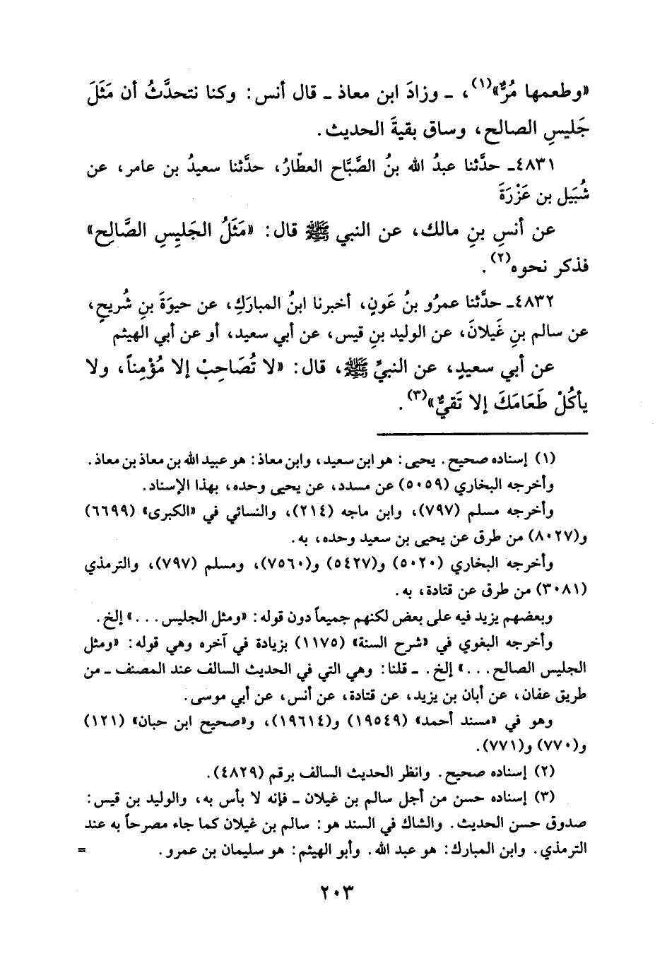 عن أبي سعيدِ، عن النبيِّ- صلى الله عليه وسلم -، قال: "لا تُصَاحِبْ إلا مُؤْمِناً، ولا يأكُلْ طَعَامَكَ إلا تَقيٌّ" (¬٣).
