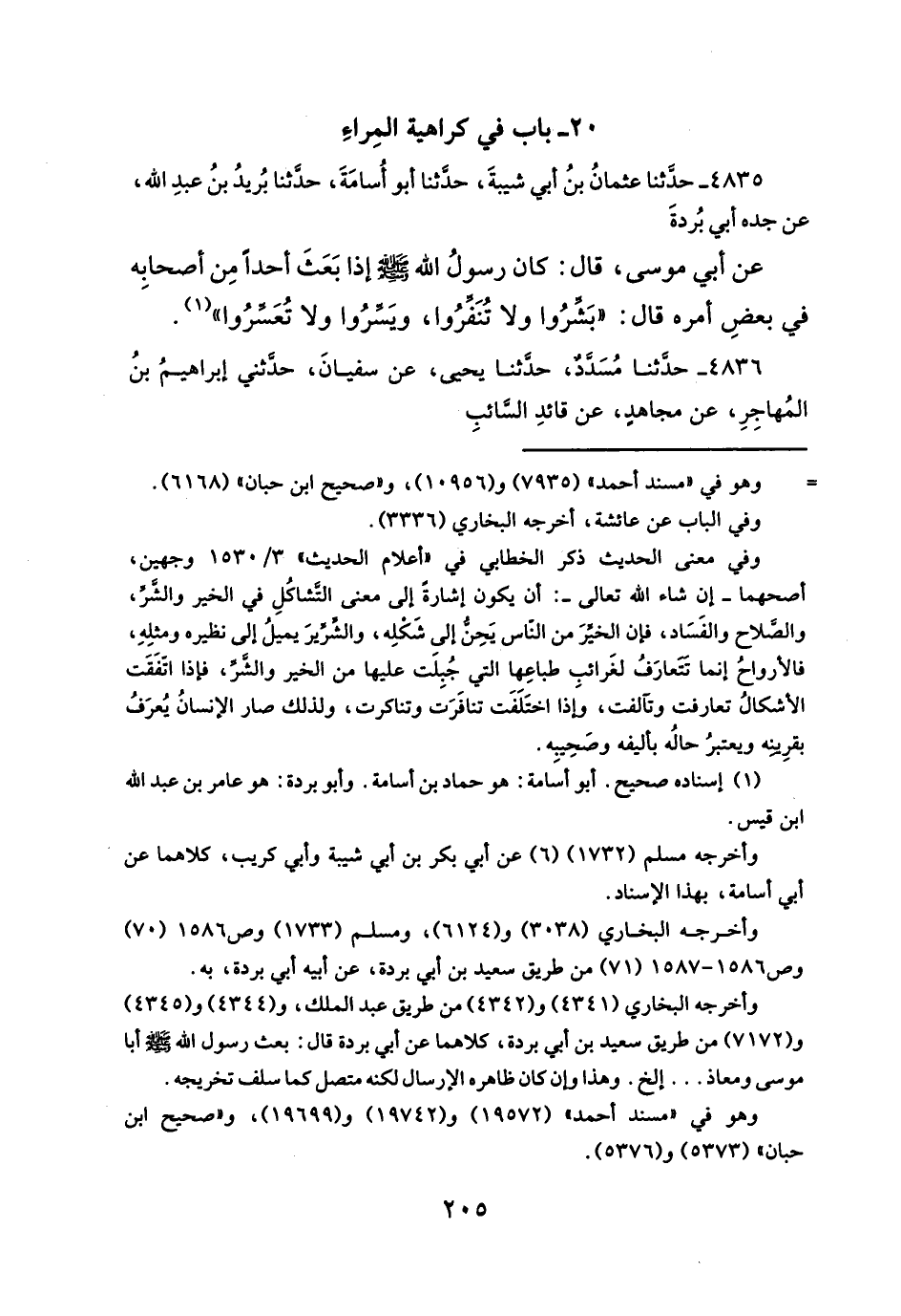 عن أبي موسى، قال: كان رسولُ الله -صلى الله عليه وسلم- إذا بَعَثَ أحداً مِن أصحابِه في بعضِ أمره قال: "بَشِّرُوا ولا تُنَفِّرُوا، ويَسِّرُوا ولا تُعَسِّرُوا" (¬١).