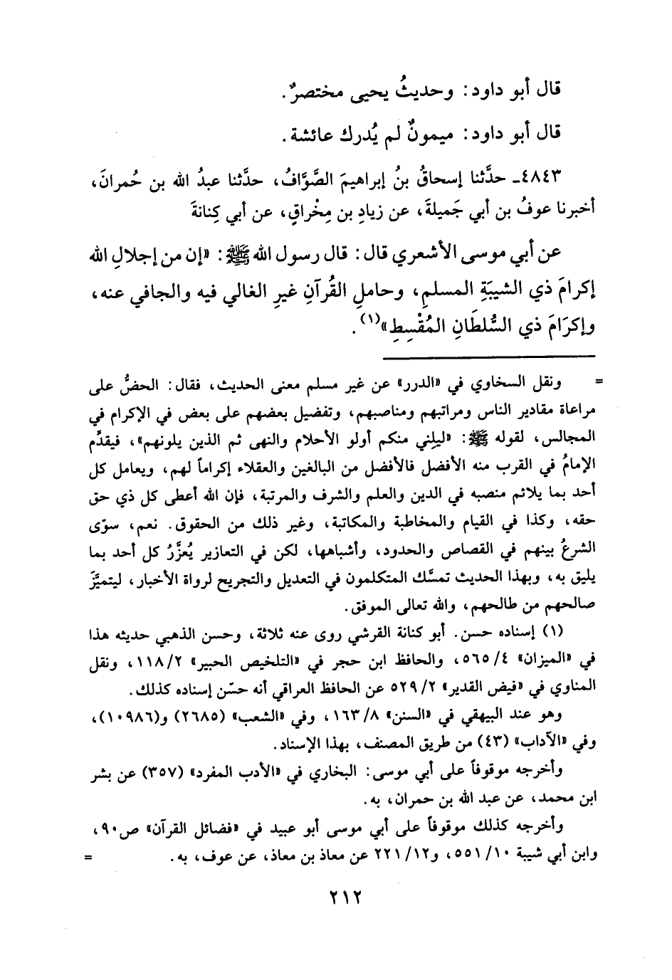 عن أبي موسى الأشعري قال: قال رسول الله -صلى الله عليه وسلم-: "إن من إجلالِ الله إكرامَ ذي الشيبَةِ المسلمِ، وحاملِ القُرآنِ غيرِ الغالي فيه والجافي عنه، وإكرَامَ ذي السُّلطَانِ المُقْسِطِ" (¬١).