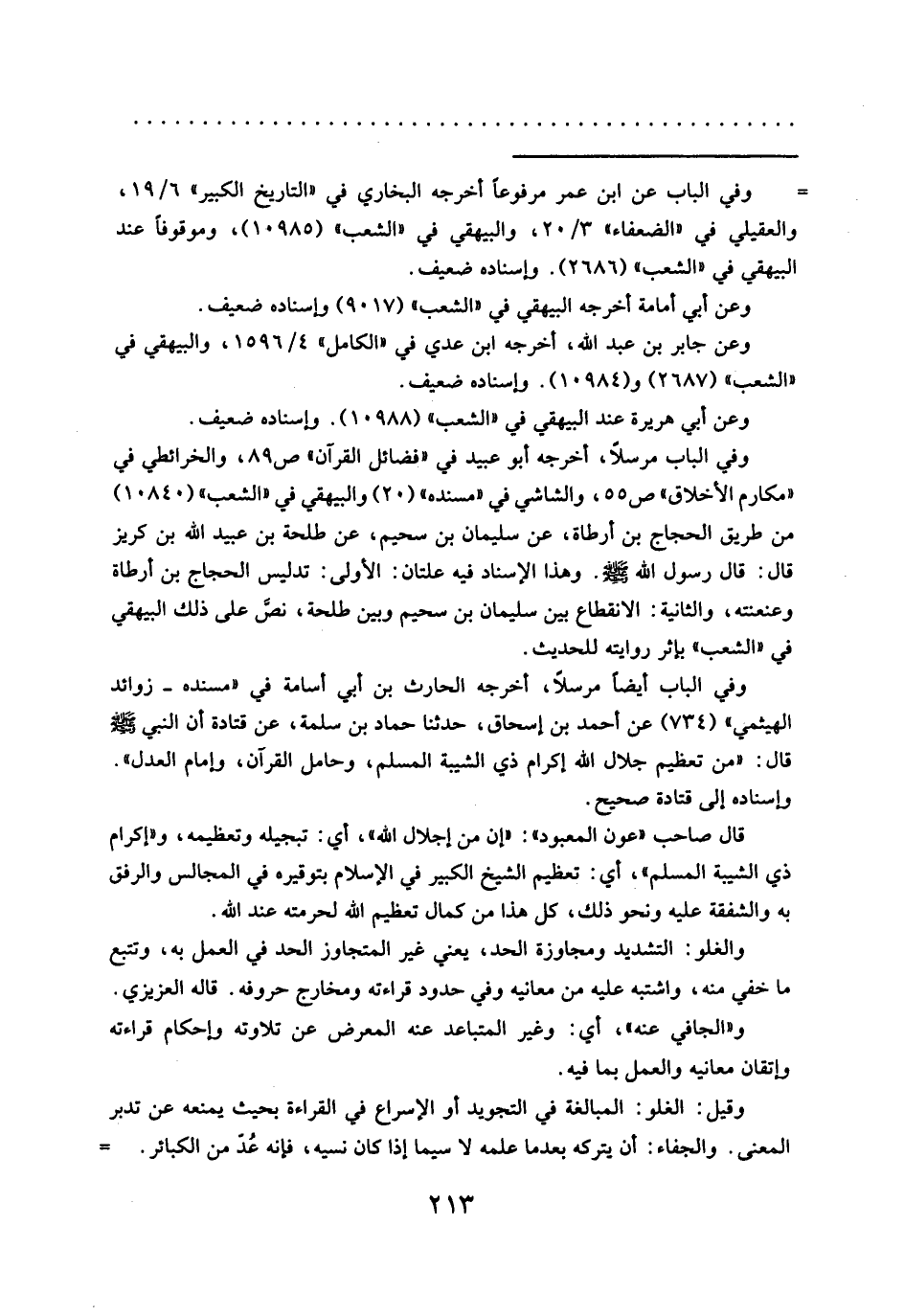 وقيل: الغلو: المبالغة في التجويد أو الاسراع في القراءة بحيث يمنعه عن تدبر المعنى. والجفاء: أن يتركه بعد ما علمه لا سيما إذا كان نسيه , فإنه عُدّ من الكبائر. =