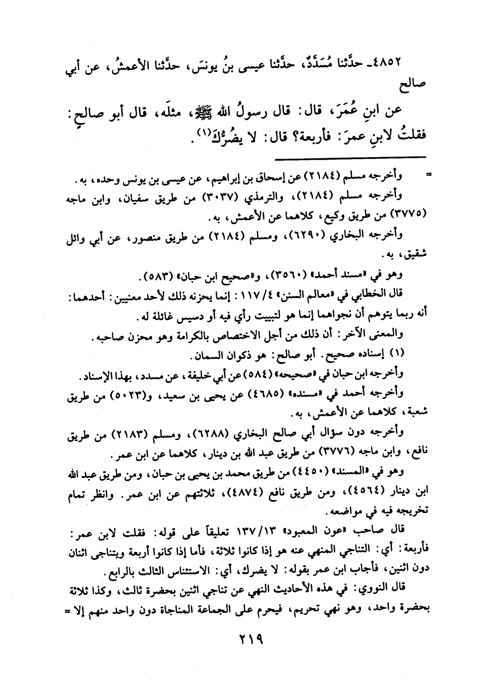 قال صاحب "عون المعبود" ١٣/ ١٣٧ تعليقاً على قوله: فقلت لابن عمر: فأربعة: أي: التناجي المنهي عنه هو إذا كانوا ثلاثة، فأما إذا كانوا أربعة ويتناجى اثنان دون اثنين، فأجاب ابن عمر بقوله: لا يضرك، أي: الاستئناس الثالث بالرابع.