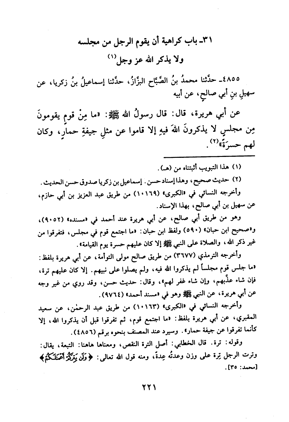 ٣١ - باب كراهية أن يقوم الرجل من مجلسه ولا يذكر الله عز وجل (¬١)