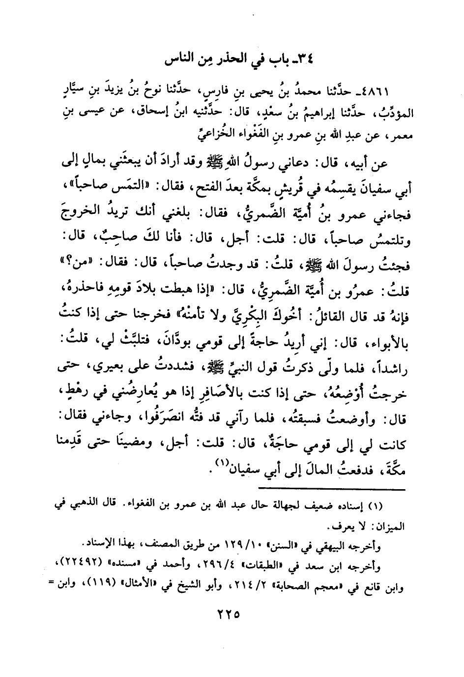عن أبيه، قال: دعاني رسولُ الله -صلى الله عليه وسلم- وقد أرادَ أن يبعثَني بمالٍ إلى أبي سفيانَ يقسِمُه في قُريشٍ بمكة بعدَ الفتح، فقال: "التمَس صاحباً"، فجاءني عمرو بنُ أميّه الضَمرىُّ، فقال: بلغني أنك تريدُ الخروجَ وتلتمسُ صاحباً، قال: قلت: أجل، قال: فانا لكَ صاحِبٌ، قال: فجئتُ رسولَ الله -صلى الله عليه وسلم-، قلتُ: قد وجدتُ صاحباً، قال: فقال: "من؟ " قلتُ: عمرُو بن أُميّه الضَّمرِىُّ، قال: "إذا هبطت بلادَ قومِهِ فاحذرهُ، فإنهُ قد قال القائلُ: أخُوكَ البِكرِيَّ ولا تأمنْه" فخرجنا حتى إذا كنتُ بالأبواء، قال: إني أرِيدُ حاجةً إلى قومي بودَّانَ، فتلبَّثْ لي، قلتُ: راشداً، فلما ولّى ذكرتُ قول النبي-صلى الله عليه وسلم-، فشددتُ على بعيري، حتى خرجتُ أوْضِعُهُ، حتى إذا كنت بالأصَافِرِ إذا هو يُعارِضُني في رهطٍ، قال: وأوضعتُ فسبقتُه، فلما رآني قد فتُّه انصَرَفُوا، وجاءني فقال: كانت لي إلى قومي حاجَةٌ، قال: قلت: أجل، ومضينَا حتى قَدِمنا مكَةَ، فدفعتُ المالَ إلى أبي سفيان (¬١).
