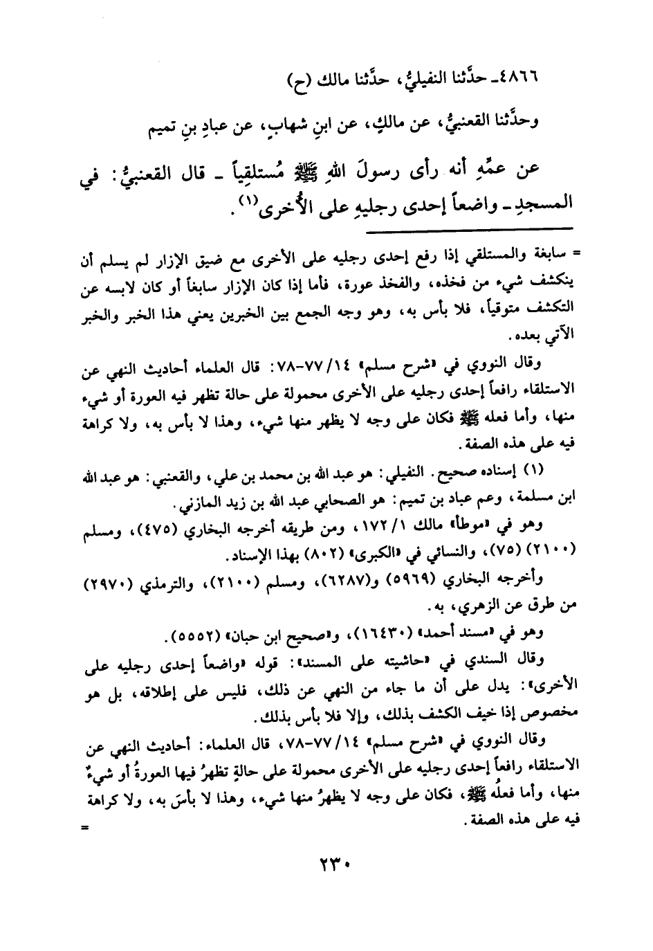 وقال النووي في "شرح مسلم" ١٤/ ٧٧ - ٧٨، قال العلماء: أحاديث النهي عن الاستلقاء رافعا إحدى رجليه على الأخرى محمولة على حاله تظهرُ فيها العورةُ أو شيءٌ منها، وأما فعلُه - صلى الله عليه وسلم -، فكان على وجه لا يظهرُ منها شيء، وهذا لا بأس به، ولا كراهة فيه على هذه الصفة. =