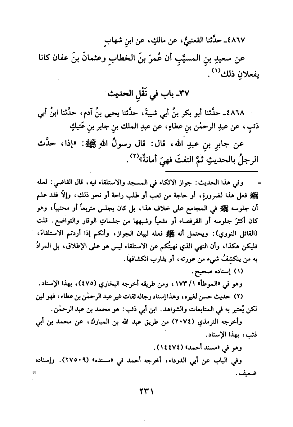 ٤٨٦٨ - حدَّثنا أبو بكر بنُ أبي شيبةَ، حدَّثنا يحيى بنُ آدم، حدَّثنا ابنُ أبي ذئبٍ، عن عبدِ الرحمن بنِ عطاءٍ، عن عبدِ الملك بنِ جابر بنِ عَتيكٍ