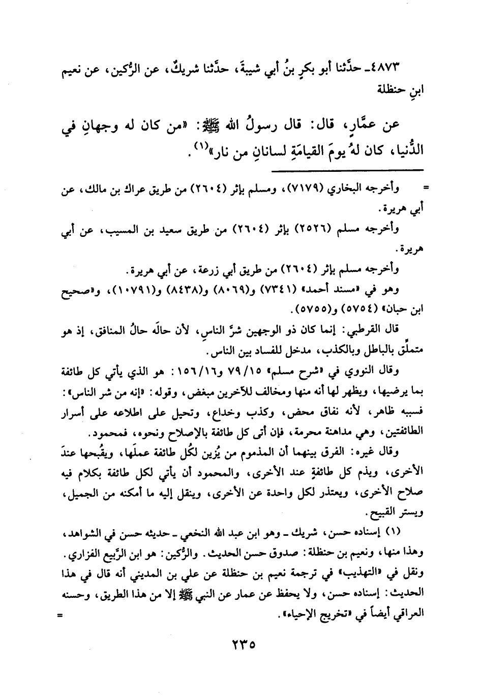 عن عمَّارِ، قال: قال رسولُ الله -صلى الله عليه وسلم-: "من كان له وجهانِ في الدُنيا، كان لهُ يومَ القيامَةِ لسانانِ من نار" (¬١).