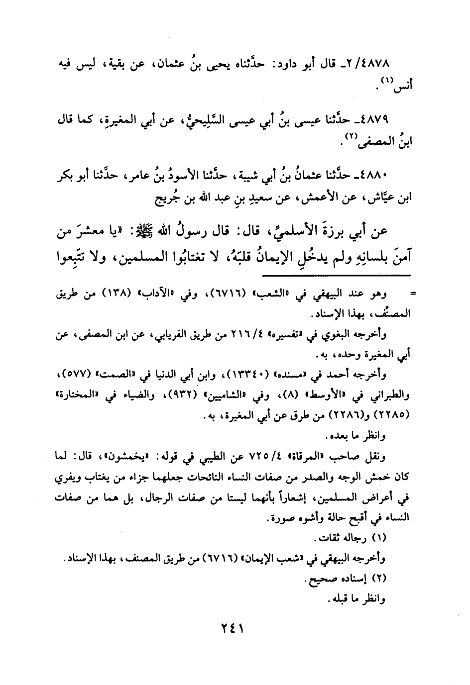 عن أبي برزةَ الأسلمىِّ، قال: قال رسولُ الله -صلى الله عليه وسلم-: "يا معشرَ من آمنَ بلسانِهِ ولم يدخُلِ الإيمانُ قلبَهُ، لا تغتابُوا المسلمين، ولا تتبِعوا