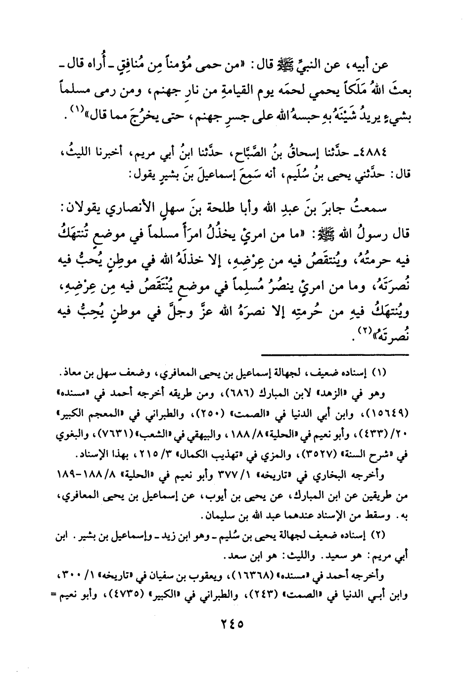 سمعتُ جابرَ بنَ عبدِ الله وأبا طلحة بنَ سهلٍ الأنصاري يقولان: قال رسولُ الله -صلى الله عليه وسلم-:" ما من امرئٍ يخذُلُ امرَأً مسلماً في موضعِ تُنتهَكُ فيه حرمتُهُ، ويُنتقَصُ فيه من عِرْضِهِ، إلا خذلَهُ الله في موطِنٍ يُحبُّ فيه نُصرَتَهُ، وما من امرئٍ ينصُرُ مُسلِماً في موضعِ يُنْتَقَصُ فيه مِن عِرْضِهِ، ويُنتهَكُ فيهِ من حُرمتِه إلا نصرَهُ الله عَزَّ وَجَلَّ في موطنٍ يُحِبُّ فيه نُصرتَه" (¬٢).
