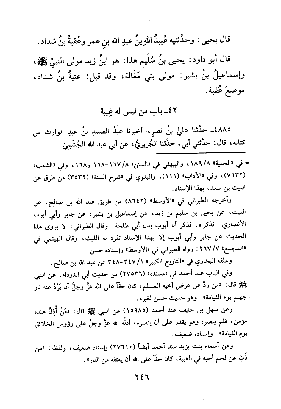 وعن أسماء بنت يزيد عند أحمد أيضاً (٢٧٦١٠) بإسناد ضعيف، ولفظه: "من ذَبَّ عن لحم أخيه في الغيبة، كان حقاً على الله أن يعتقه من النار".