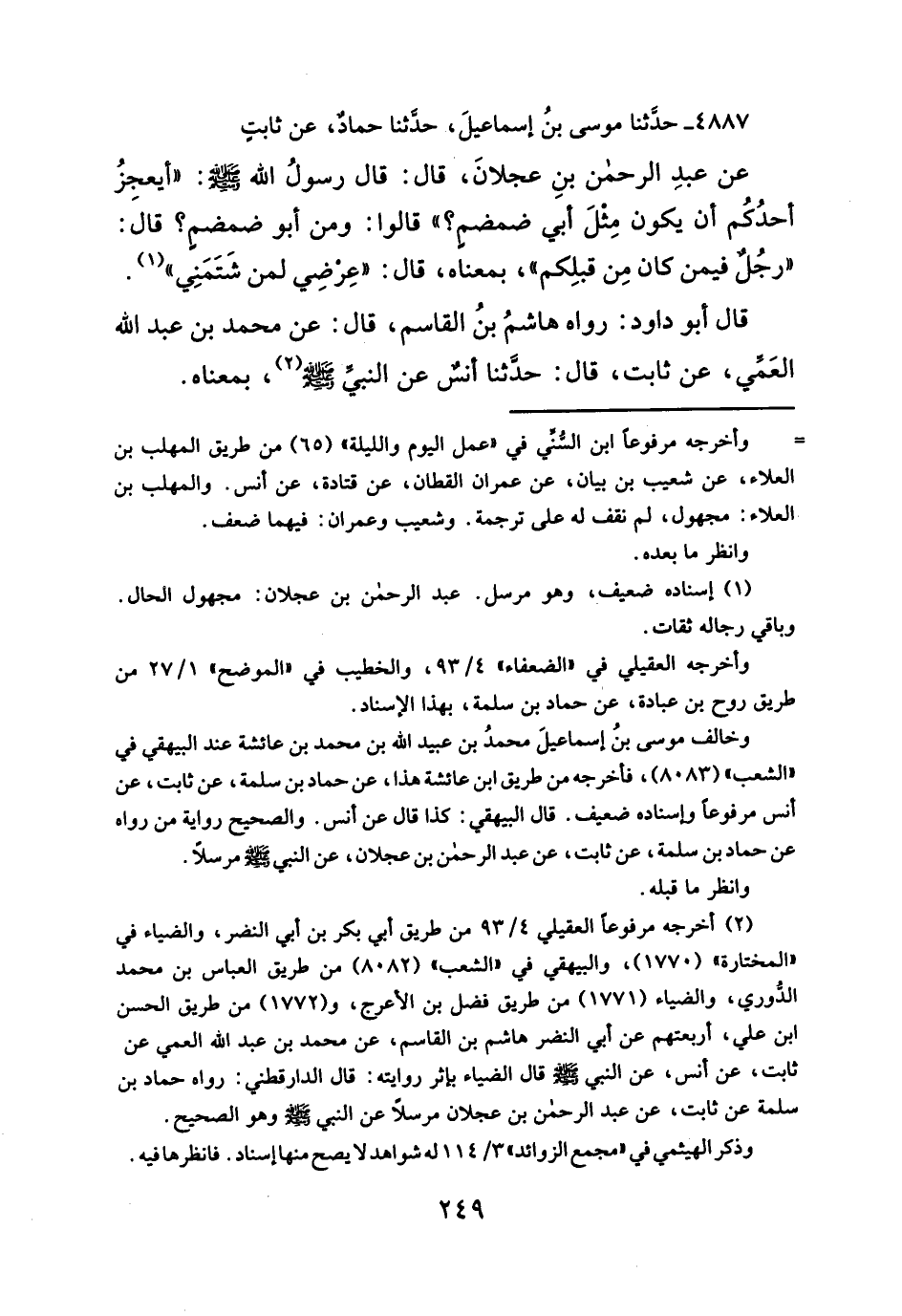 (¬٢) أخرجه مرفرعا العقيلي ٤/ ٩٣ من طريق أبي بكر بن أبي النضر، والضياء في "المختارة" (١٧٧٠)، والبيهقي في "الشعب" (٨٠٨٢) من طريق العباس بن محمَّد الدُّوري، والضياء (١٧٧١) من طريق فضل بن الأعرج، و (١٧٧٢) من طريق الحسن ابن علي، أربعتهم عن أبي النضر هاشم بن القاسم، عن محمَّد بن عبد الله العمي عن ثابت، عن أنس، عن النبي-صلى الله عليه وسلم-قال الضياء بإثر روايته: قال الدارقطني: رواه حماد بن سلمة عن ثابت، عن عبد الرحمن بن عجلان مرسلاً عن النبي -صلى الله عليه وسلم- وهو الصحيح.