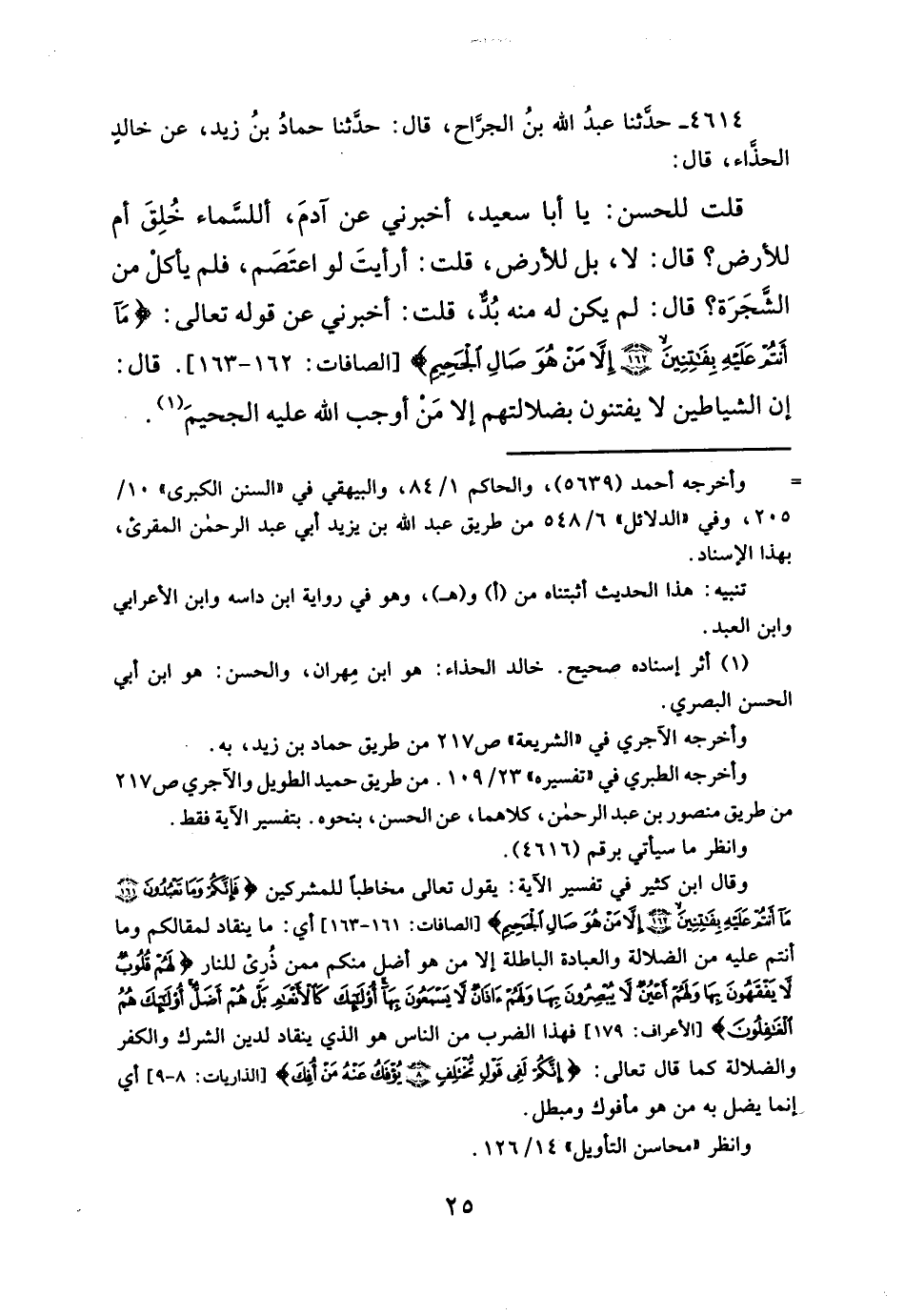 قلت للحسن: يا أبا سعيد، أخبرني عن آدمَ، أللسَّماء خُلِقَ أم للأرض؟ قال: لا، بل للأرض، قلت: أرأيتَ لو اعتَصَم، فلم يأكلْ من الشَّجَرَة؟ قال: لم يكن له منه بُدٌّ، قلت: أخبرني عن قوله تعالى: {مَا أَنْتُمْ عَلَيْهِ بِفَاتِنِينَ (١٦٢) إِلَّا مَنْ هُوَ صَالِ الْجَحِيمِ} [الصافات: ١٦٢، ١٦٣]. قال: إن الشياطين لا يفتنون بضلالتهم إلا مَن أوجب الله عليه الجحيمَ (¬١).
