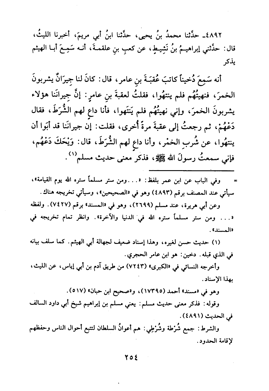 أنه سَمعَ دُخيناً كاتبَ عُقبَةَ بنِ عامر، قال: كانَ لنا جِيرَانٌ يشربونَ الخمرَ، فنهيتُهُم فلم ينتهُوا، فقلتُ لعقبةَ بنِ عامرٍ: إنَّ جِيرانَنا هؤلاء يشربونَ الخمرَ، وإني نهيتُهُم فلم يَنتَهوا، فأنا داعٍ لهم الشُّرَطَ، فقال دَعْهُمْ، ثم رجعتُ إلى عقبةَ مرةً أخرى، فقلت: إن جيرانَنا قد أبَوا أن ينتهُوا، عن شُربِ الحْمْر، وأنا داعٍ لهم الشُرَطَ، قال: وَيْحَكَ دَعْهُم، فإني سمعتُ رسولَ الله -صلى الله عليه وسلم -، فذكر معنى حديث مسلم (¬١).
