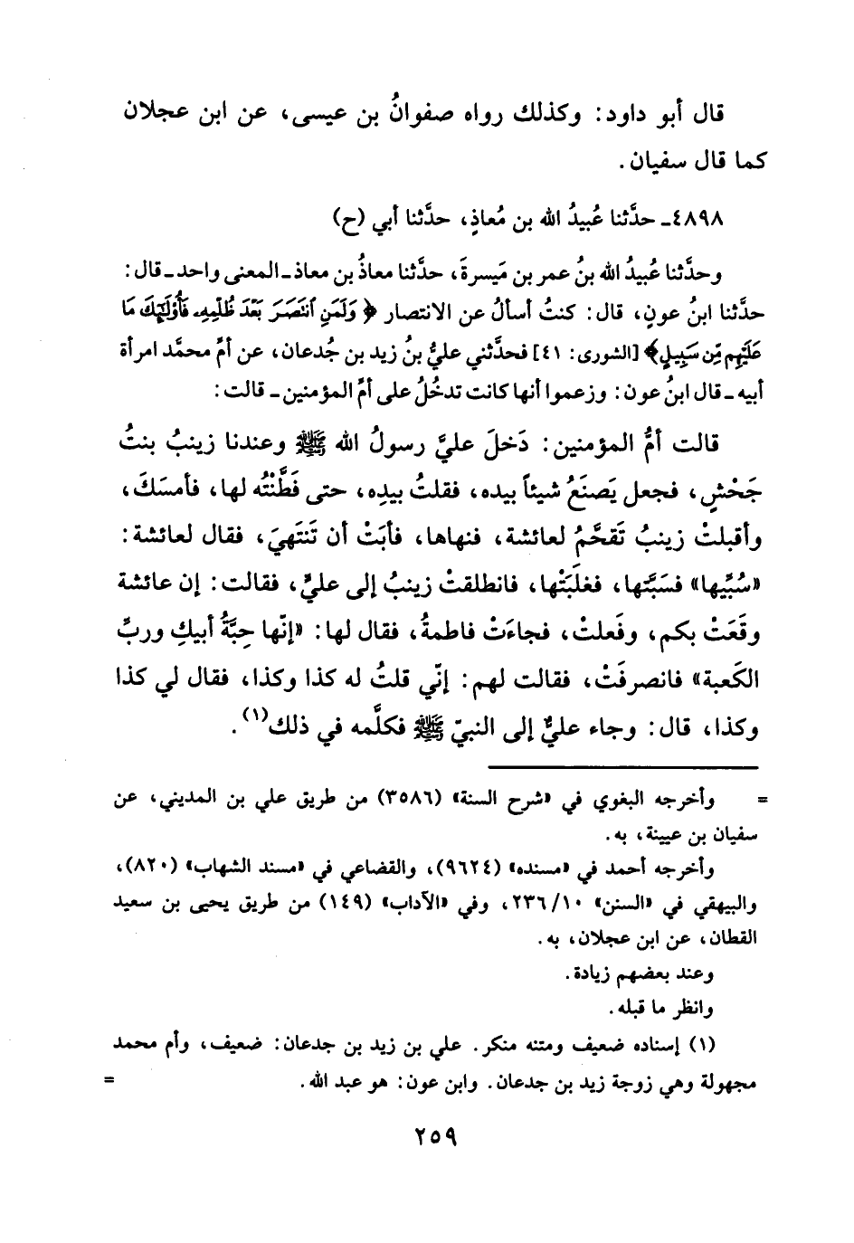 وحدَّثنا عُبيدُ الله بنُ عمر بن مَيسرةَ، حدَّثنا معاذُ بن معاذ -المعنى واحد- قال: حدَّثنا ابنُ عونٍ، قال: كنتُ أسألُ عن الانتصار {وَلَمَنِ انْتَصَرَ بَعْدَ ظُلْمِهِ فَأُولَئِكَ مَا عَلَيْهِمْ مِنْ سَبِيلٍ} [الشورى:٤١]، فحذَثني علي بنُ زيد بن جُدعان، عن أمِّ محمَّد امرأة أبيه -قال ابنُ عون: وزعموا أنها كانت تدخُلُ على أمِّ المؤمنين- قالت: