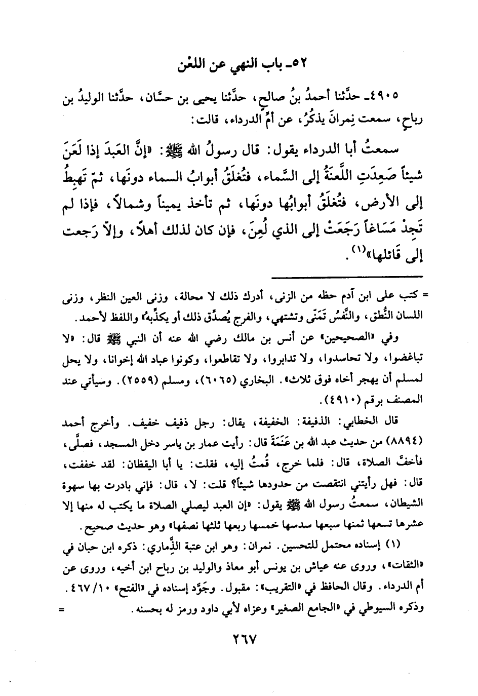 سمعتُ أبا الدرداء يقول: قال رسولُ الله -صلى الله عليه وسلم-: "أنَّ العَبدَ إذا لَعَنَ شيئاً صَعِدَتِ اللَّعنَةُ إلى السَّماء، فتُغلَقُ أبوابُ السماء دونَها، ثمّ تَهبِطُ إلى الأرض، فتُغلَقُ أبوابُها دونَها، ثم تأخذ يميناً وشمالاً، فإذا لم تَجِدْ مَسَاغاً رَجَعَت إلى الذي لُعِنَ، فإن كان لذلك أهلاً، وإلا رَجعت إلى قَائلها" (¬١).