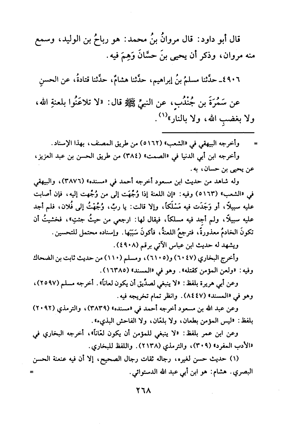 عن سَمُرَةَ بن جُنْدُبٍ، عن النبيِّ - صلى الله عليه وسلم - قال: "لا تلاعَنُوا بلعنةِ الله، ولا بغضبِ الله، ولا بالنار" (¬١).