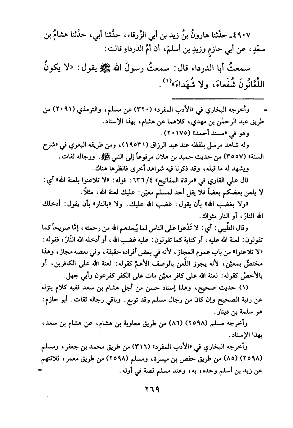 سمعتُ أبا الدرداء قال: سمعتُ رسولَ الله -صلى الله عليه وسلم -يقول: "لا يكونُ اللعَّانُونَ شُفَعاءَ، ولا شُهَداءَ" (¬١).