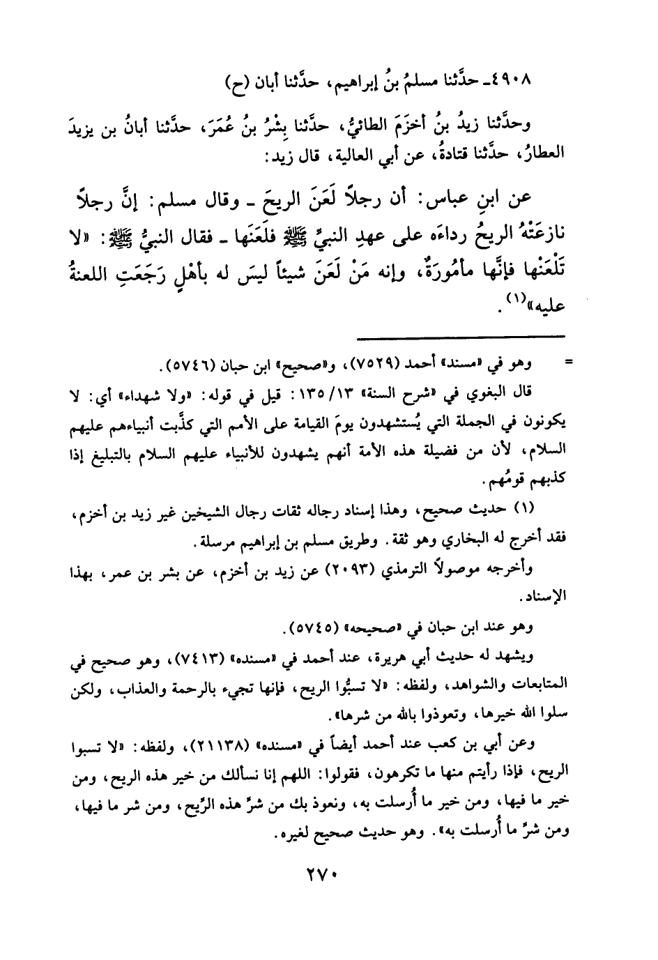 عن ابنِ عباس: أن رجلاً لَعَنَ الريحَ -وقال مسلم: إنَّ رجلاً نازعَتْهُ الريحُ رداءَه على عهدِ النبيَّ- صلى الله عليه وسلم - فلعَنَها- فقال النبيَّ- صلى الله عليه وسلم -: (لا تَلْعَنْها فإنَّها مأمُورَةٌ، وإنه مَنْ لَعَنَ شيئاً ليسَ له بأهْلٍ رَجَعَتِ اللعنةُ عليه" (¬١).