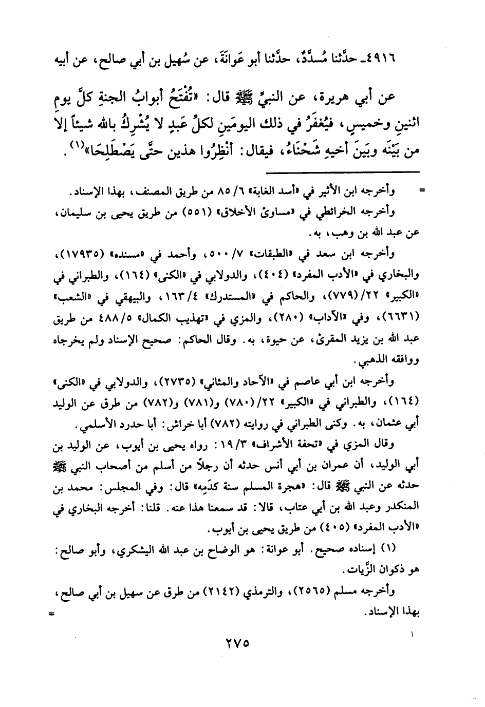 ٤٩١٦ - حدَّثنا مُسدِّدٌ، حدَّثنا أبو عَوانَةَ، عن سُهيل بن أبي صالح، عن أبيه