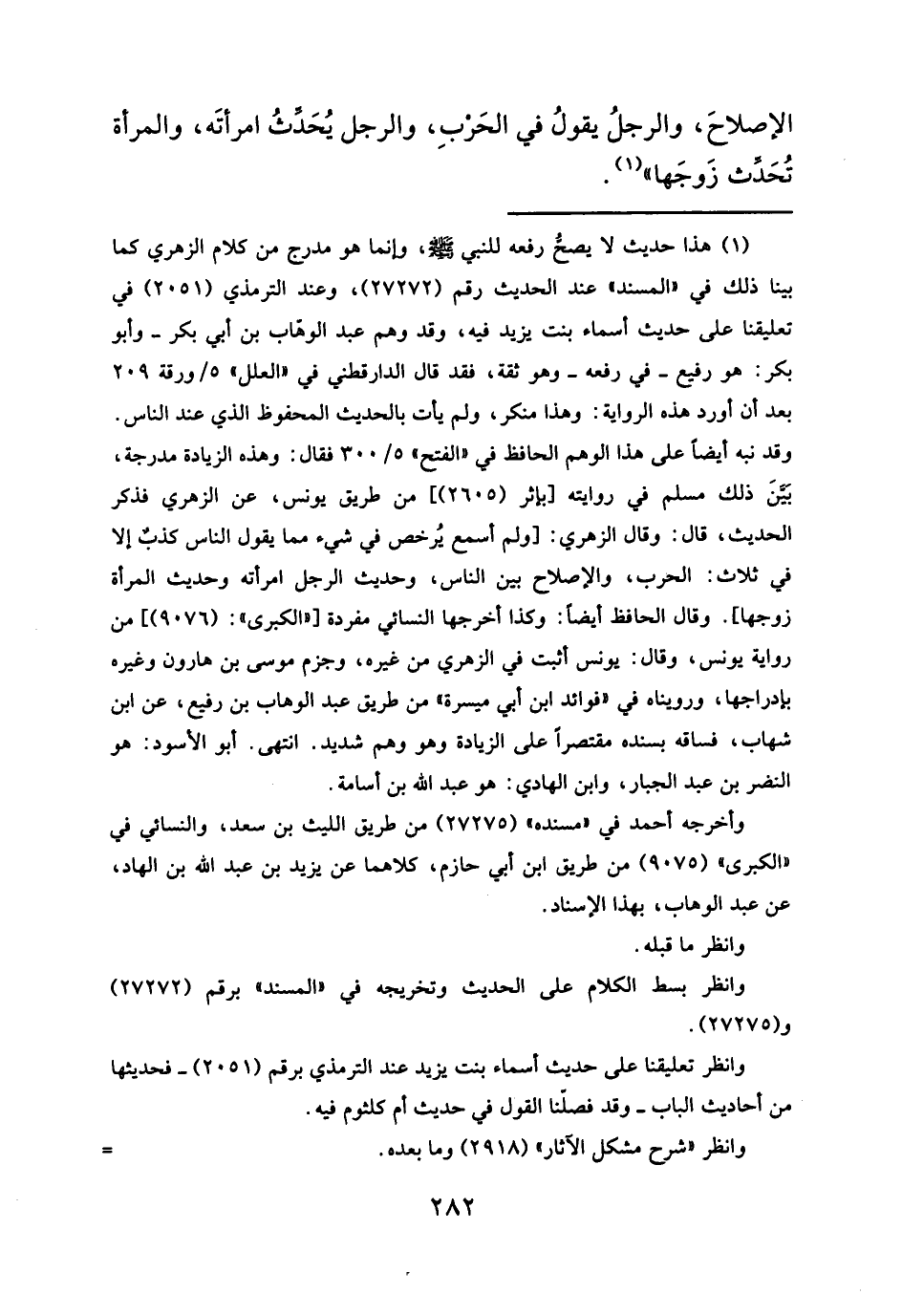 (¬١) هذا حديث لا يصحُّ رفعه للنبي - صلى الله عليه وسلم -، وإنما هو مدرج من كلام الزهري كما بينا ذلك في "المسند" عند الحديث رقم (٢٧٢٧٢)، وعند الترمذي (٢٥٥١) في تعليقنا على حديث أسماء بنت يزيد فيه، وقد وهم عبد الوهاب بن أبي بكر- وأبو بكر: هو رفيع -في رفعه- وهو ثقة، فقد قال الدارقطني في "العلل"، ٥/ ورقة ٢٠٩ بعد أن أورد هذه الرواية: وهذا منكر، ولم يأت بالحديث المحفوظ الذي عند الناس.
