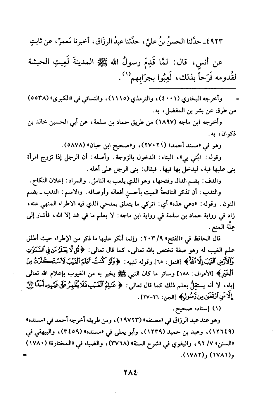 عن أنسِ، قال: لَمَّا قَدِمَ رسولُ الله -صلى الله عليه وسلم- المدينةَ لَعِبتِ الحبشة لقُدومه فَرَحاً بذلك، لَعِبُوا بجرَابِهم (¬١).