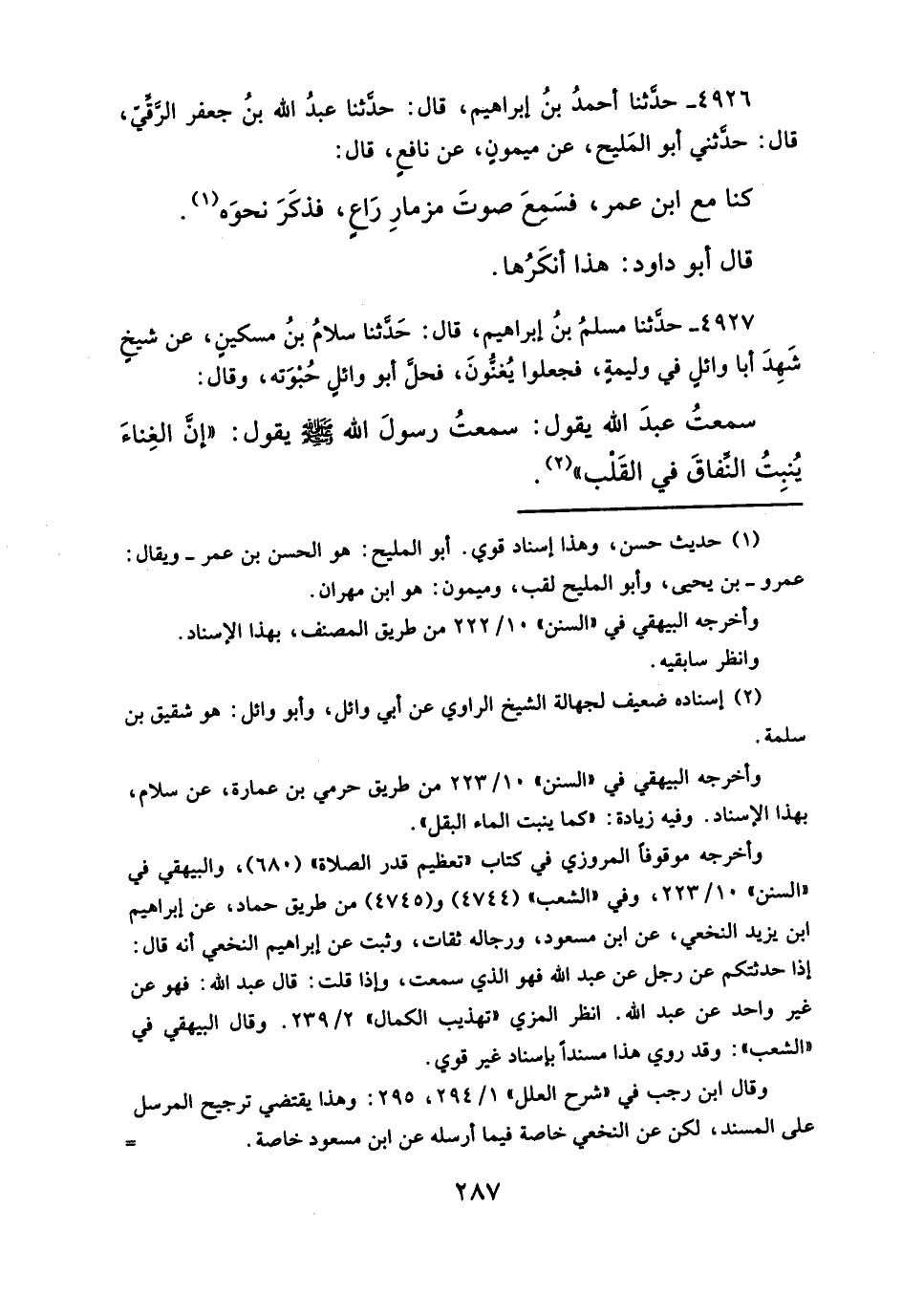 سمعتُ عبدَ الله يقول: سمعتُ رسولَ الله -صلى الله عليه وسلم - يقول: "إنَّ الغِناءَ يُنبِتُ النِّفاقَ في القَلْب" (¬٢).