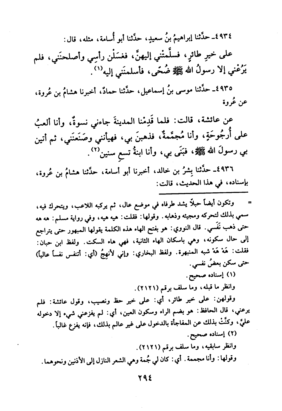 عن عائشة، قالت: فلما قَدِمْنا المدينةَ جاءني نسوةٌ، وأنا ألعبُ على أُرجُوحَةِ، وأنا مُجمَّمةٌ، فذهبنَ بي، فهيأنني وصَنَعنَني، ثم أتين بي رسولَ الله -صلى الله عليه وسلم -، فبَنَى بي، وأنا ابنةُ تسعِ سنين (¬٢).