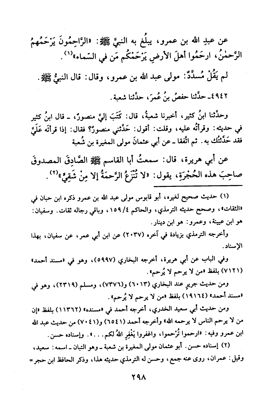 عن عبدِ الله بن عمرو، يبلُغ به النبيَّ- صلى الله عليه وسلم -: "الرَّاحِمُونَ يَرْحَمُهمُ الرَّحمنُ، ارحَمُوا أهلَ الأرضِ يَرْحْمْكُم مَن في السّماء" (¬١).