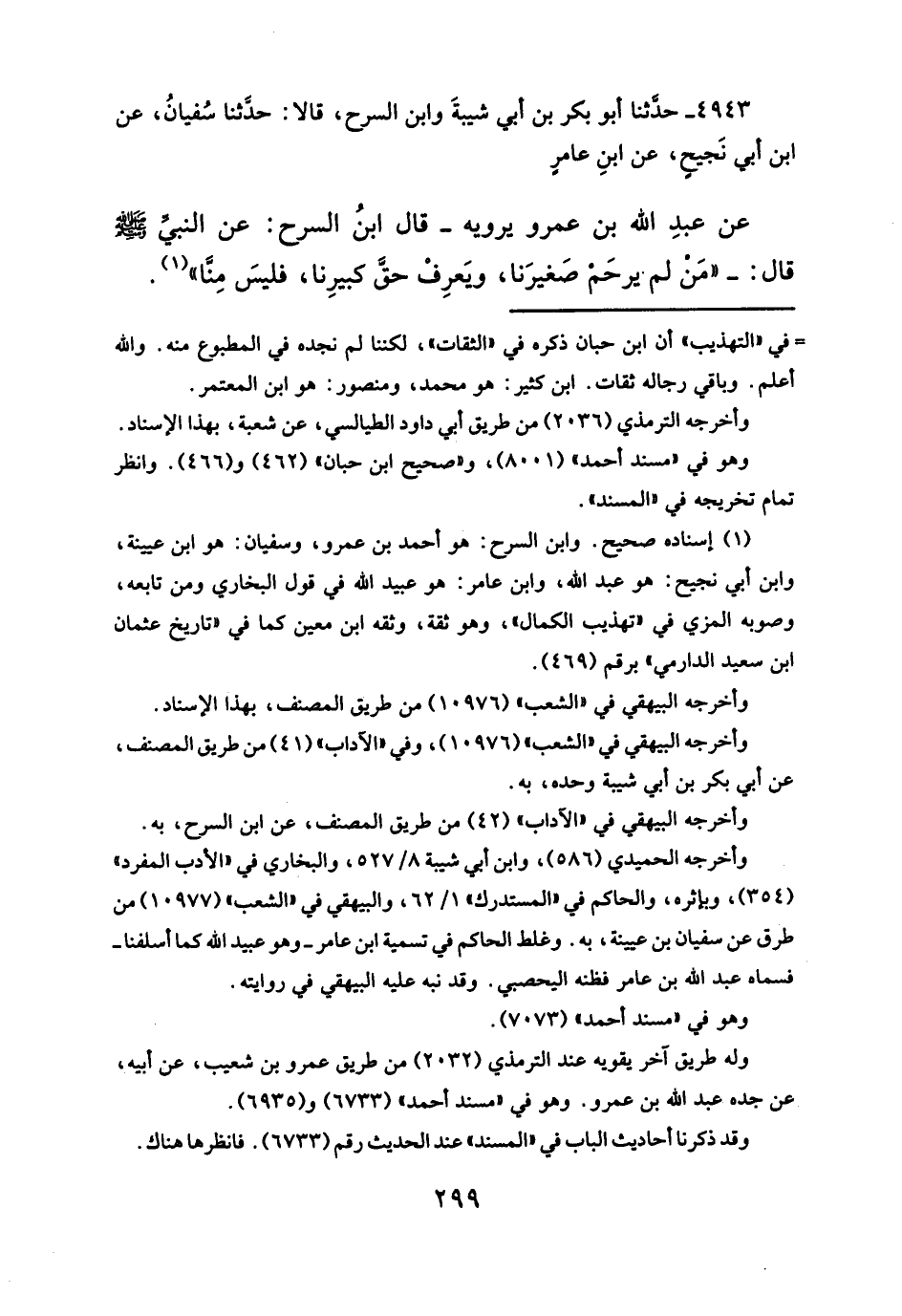 عن عبدِ الله بن عمرو يرويه -قال ابنُ السرح: عن النبيِّ- صلى الله عليه وسلم - قال:- "مَن لم يرحَمْ صَغيرَنا، ويَعرِفْ حقَّ كبيرِنا، فليسَ منَّا" (¬١).
