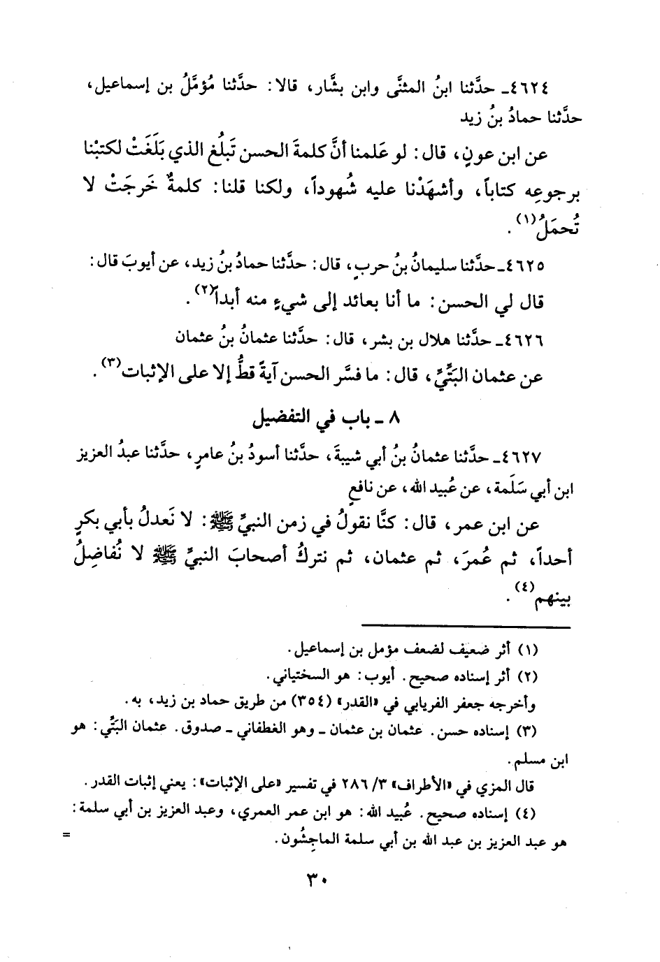 عن ابن عمر، قال: كنَّا نقولُ في زمن النبيَّ- صلى الله عليه وسلم -: لا نَعدلُ بأبي بكرِ أحداً، ثم عُمرَ، ثم عثمان، ثم نتركُ أصحابَ النبيَّ - صلى الله عليه وسلم - لا نُفاضِلُ بينهم (¬٤).