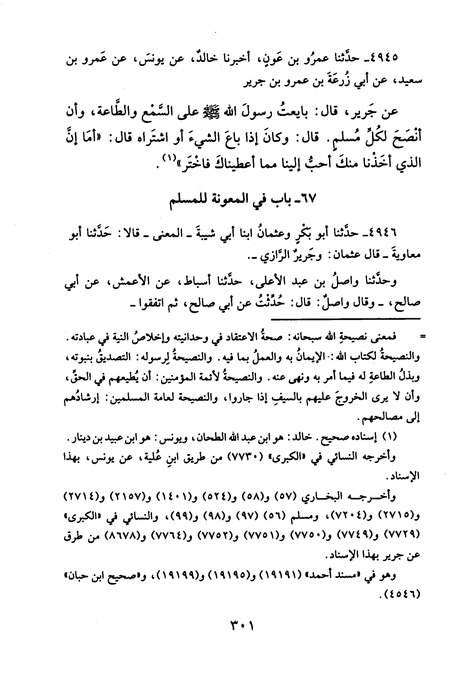 عن جَرير، قال: بايعتُ رسولَ الله -صلى الله عليه وسلم - على السَّمْع والطَاعة، وأن أنْصَحَ لكُلِّ مُسلمٍ. قال: وكانَ إذا باعَ الشيءَ أو اشتَراه قال: "أمَا إنَّ الذي أخَذنا منكَ أحبُّ إلينا مما أعطيناكَ فاخْتَر" (¬١).