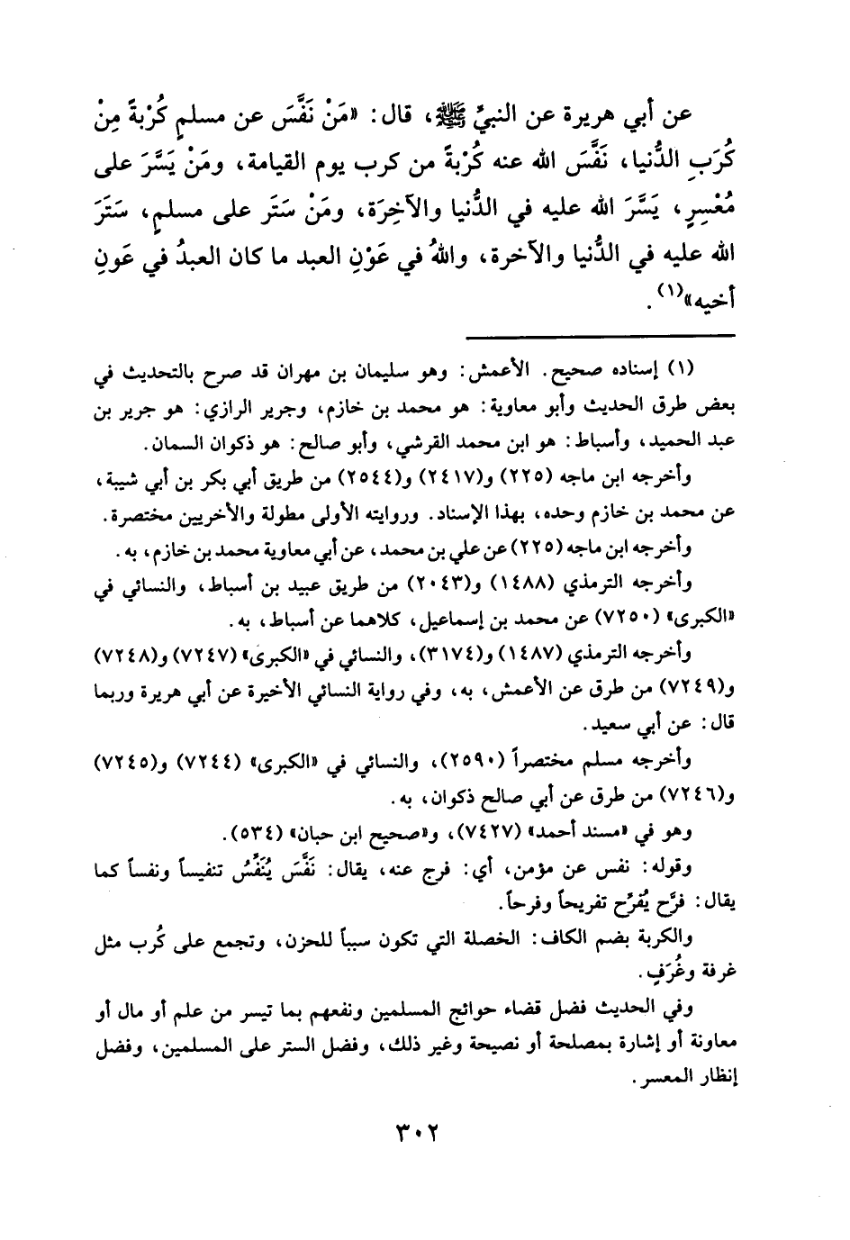 عن أبي هريرة عن النبيِّ- صلى الله عليه وسلم -، قال: "مَن نَفَّسَ عن مسلم كُرْبةً مِن كُرَبِ الدُّنيا، نَفسَ الله عنه كُرْبةً من كرب يوم القيامة، ومَن يَسَّرَ على مُعْسِرٍ، يَسَّرَ الله عليه في الدُّنيا والآخِرَة، ومَن سَتَر على مسلمٍ، سَتَرَ الله عليه في الدُّنيا والآخرة، واللهُ في عَونِ العبد ما كان العبدُ في عَونِ أخيه" (¬١).