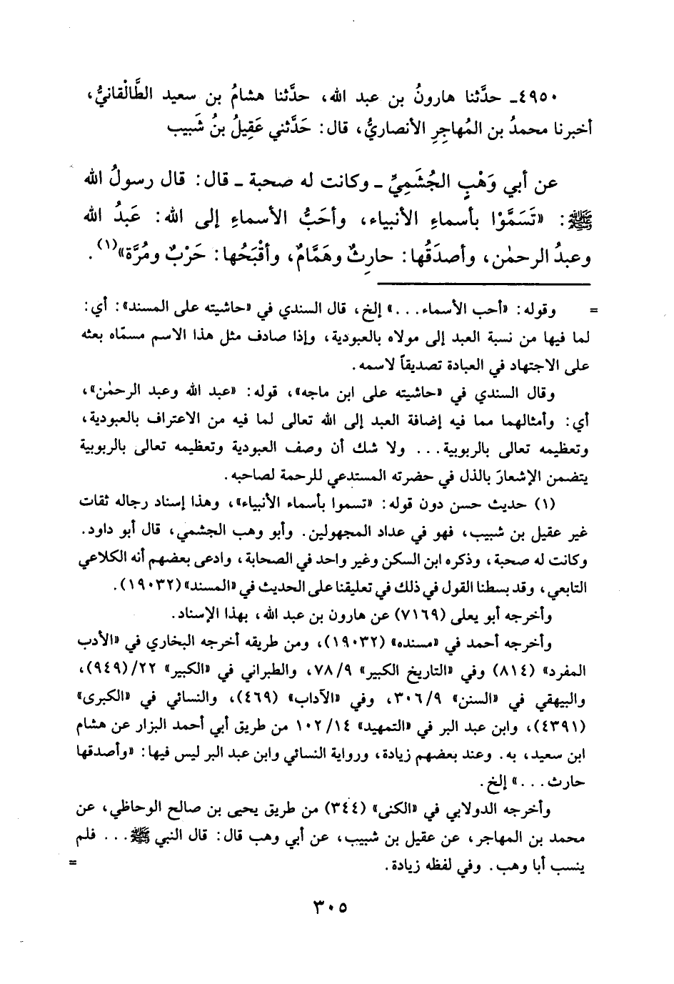 عن أبي وَهْب الجُشَمِىّ -وكانت له صحبة- قال: قال رسولُ الله -صلى الله عليه وسلم-: "تَسَمَّوْا بأسَماءِ الأنبياء، وأحَبُّ الأسماءِ إلى الله: عَبدُ الله وعبدُ الرحمن، وأصدَقُها: حارِثٌ وهَمَّامٌ، وأقْبَحُها: حَرْبٌ ومُرَّة" (¬١).