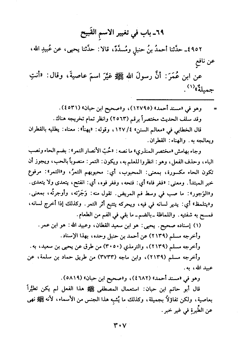 عن ابن عُمَرَ: أن رسولَ الله -صلى الله عليه وسلم - غيَّرَ اسمَ عاصيةَ، وقال: " أنتِ جميلةٌ" (¬١).