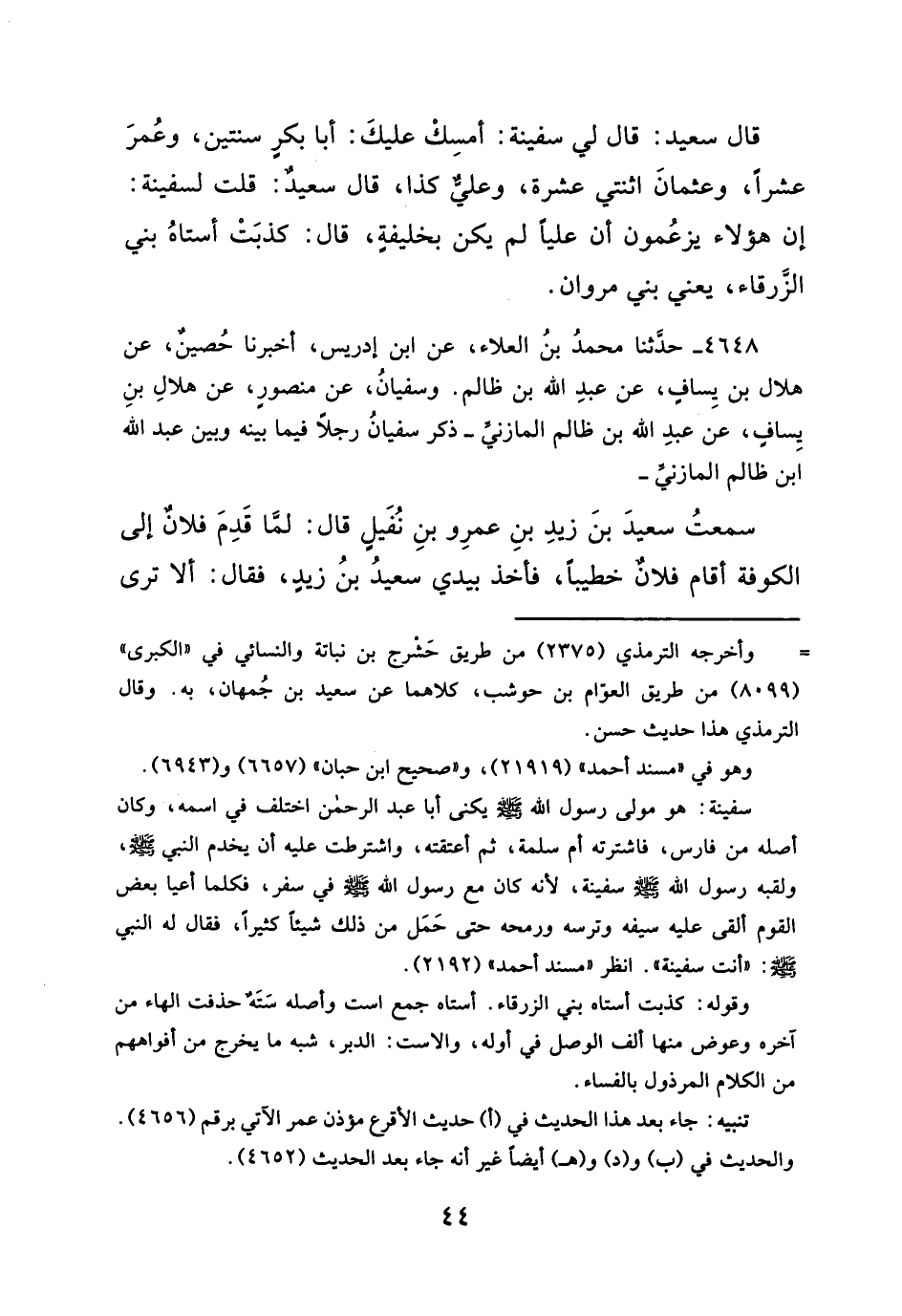 قال سعيد: قال لي سفينة: أمسِكْ عليكَ: أبا بكرٍ سنتين، وعُمرَ عشراً، وعثمانَ اثنتي عشرة، وعليٌّ كذا، قال سعيدٌ: قلت لسفينة: إن هؤلاء يزعُمون أن علياً لم يكن بخليفةٍ، قال: كذبَتْ أستاهُ بني الزَّرقاء، يعني بني مروان.