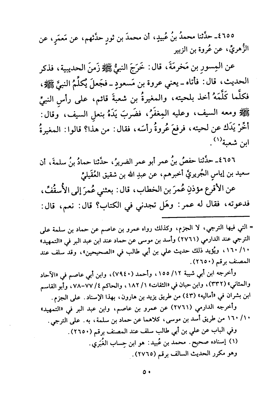 عن المِسورِ بن مَخرمَةَ، قال: خَرَجَ النبُيُّ - صلى الله عليه وسلم - زَمنَ الحديبية، فذكر الحديث، قال: فأتاه -يعني عروة بن مَسعودٍ- فجَعلَ يكلمُ النبيَّ -صلى الله عليه وسلم-، فكلّما كَلمهُ أخذ بلحيته، والمغيرةُ بن شعبةَ قائم، على رأسِ النبيِّ - صلى الله عليه وسلم - ومعه السيف، وعليه المِغفَرُ، فضَربَ يَدَهُ بنعلِ السيف، وقال: أخِّرْ يَدَك عن لحيته، فرفعَ عُروةُ رأسَه، فقال: من هذا؟ قالوا: المغيرةُ ابن شعبة (¬١).