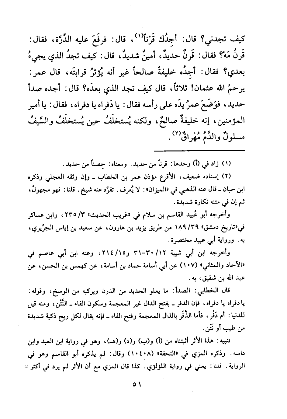 كيف تجدني؟ قال: أجِدُك قَرْناً (¬١)، قال: فرفَعَ عليه الدَرَّة، فقال: قَرنُ مَهْ؟ فقال: قَرن حديدٌ، أمينُ شديدُ، قال: كيف تجدُ الذي يجيءُ بعدي؟ فقال: أجِدُه خليفةً صالحاً غير أنه يُؤثرُ قرابتَه، قال عمر: يرحمُ الله عثمان! ثلاثاً، قال كيف تجد الذي بعدَه؟ قال: أجده صدأ حديد، فوَضَعَ عمرُ يدَه على رأسه فقال: يا دَفراه يا دفراه، فقال: يا أمير المؤمنين، إنه خليفةٌ صالحٌ، ولكنه يُستخلَفُ حين يُستخلَفُ والسيفُ مسلولٌ والدَّمُ مُهْراقٌ (¬٢).