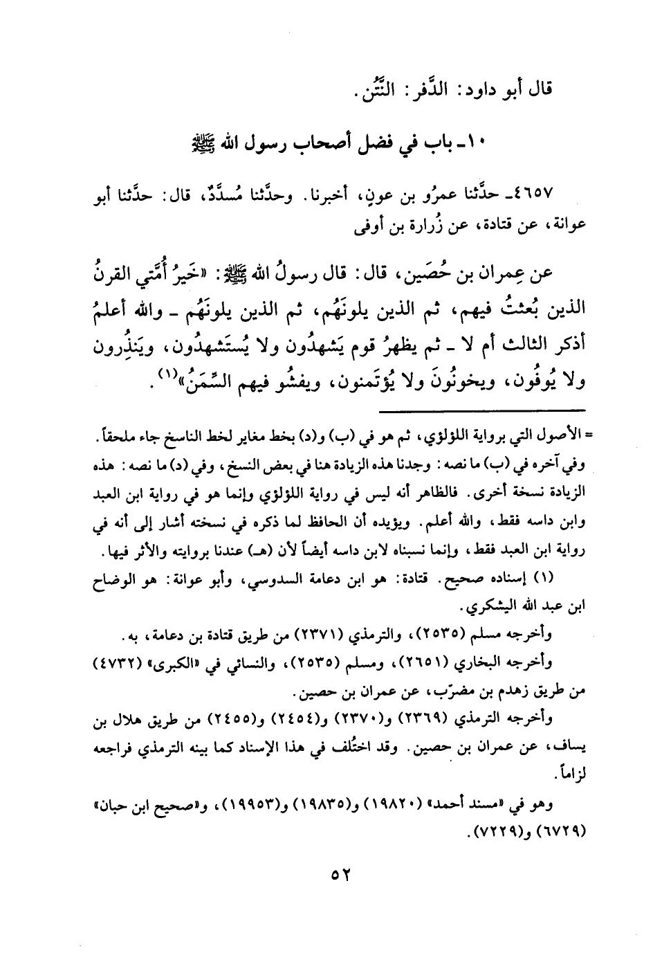 عن عِمران بن حُصَين، قال: قال رسولُ الله - صلَّى الله عليه وسلم -: "خَيرُ أُمَّتي القرنُ الذين بُعثتُ فيهم، ثم الذين يلونَهُم، ثم الذين يلونَهُم -والله أعلمُ أذكر الثالث أم لا- ثم يظهرُ قوم يَشهدُون ولا يُستَشهدُون، ويَنذُرون ولا يُوفُون، ويخونُونَ ولا يُؤتَمنون، ويفشُو فيهم السِّمَنُ" (¬١).