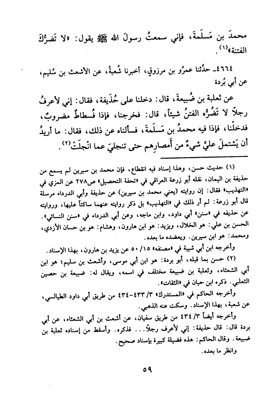محمدَ بن مَسلَمةَ، فإني سمعتُ رسولَ الله -صلى الله عليه وسلم - يقول: لا تَضرُّكَ الفتنة" (¬١).