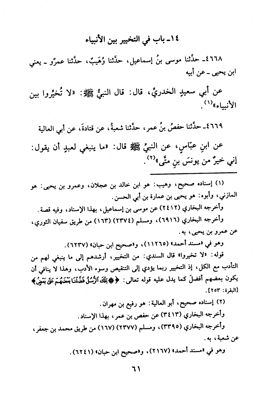 عن أبي سعيدٍ الخدريِّ، قال: قال النبيُّ - صلى الله عليه وسلم -: "لا تُخيِّروا بين الأنبياء" (¬١).