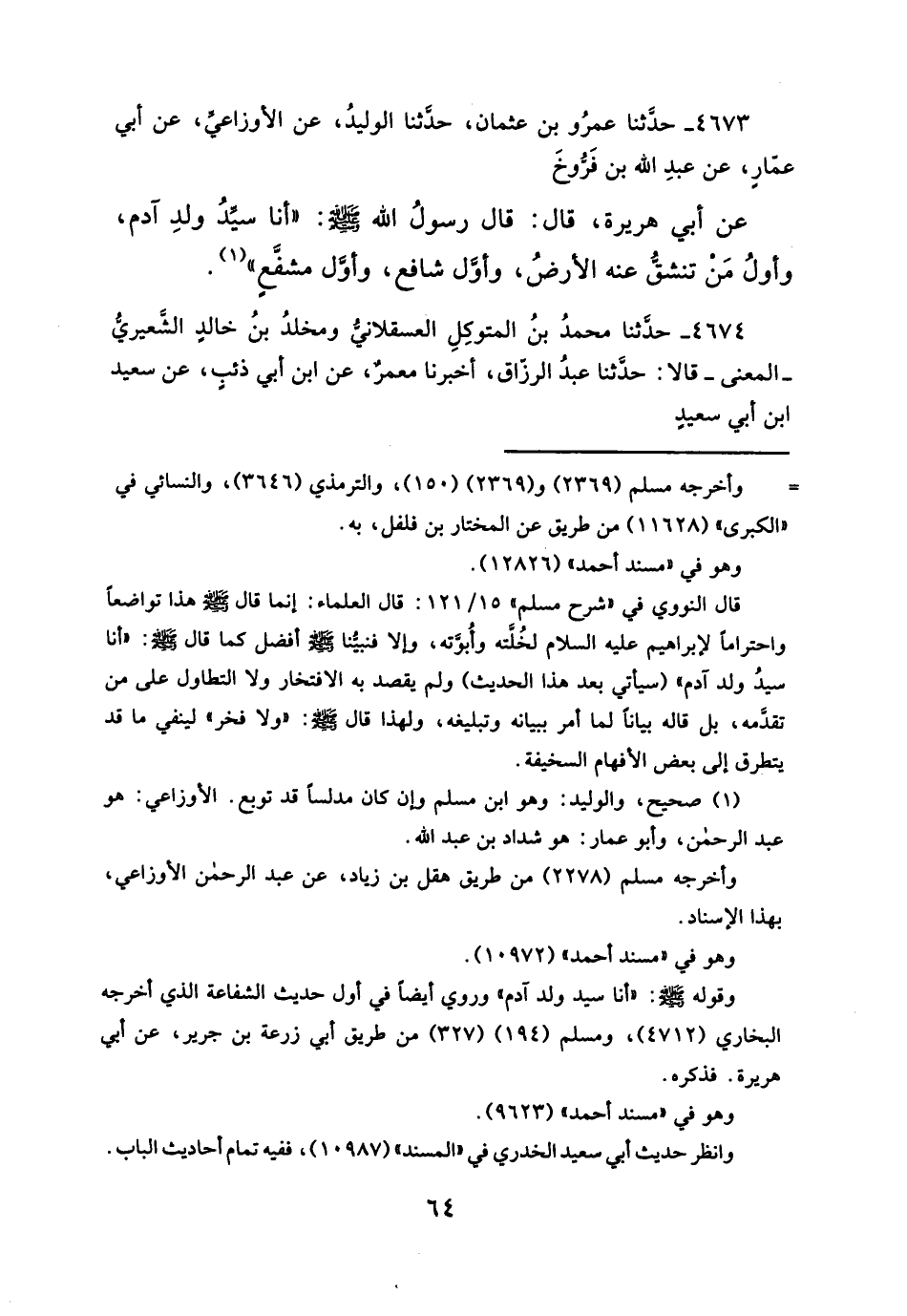 وقوله - صلى الله عليه وسلم -: "أنا سيد ولد آدم" وروي أيضاً في أول حديث الشفاعة الذي أخرجه البخاري (٤٧١٢)، ومسلم (١٩٤) (٣٢٧) من طريق أبي زرعة بن جرير، عن أبى هريرة: فذكره.
