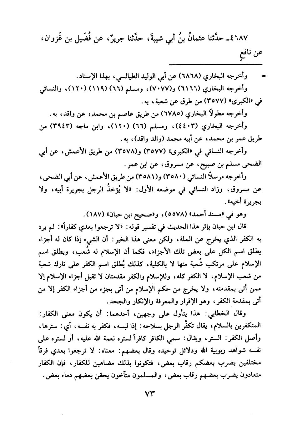 قال ابن حبان بإثر هذا الحديث في تفسير قوله: "لا ترجعوا بعدي كفاراً: لم يرد به الكفر الذي يخرج عن الملة، ولكن معنى هذا الخبر: أن الشيء إذا كان له أجزاء يطلق اسم الكل على بعض تلك الأجزاء، فكما أن الإسلام له شُعب، ويطلق اسم الإِسلام على مرتكب شُعبة منها لا بالكلية، كذلك يُطلق اسم الكفر على تارك شعبة من شعب الإسلام، لا الكفر كله، وللإسلام والكفر مقدمتان لا تقبل أجزاء الإِسلام إلا ممن أتى بمقدمته، ولا يخرج من حكم الإسلام من أتى بجزء من أجزاء الكفر إلا من أتى بمقدمة الكفر، وهو الإقرار والمعرفة والانكار والجحد.