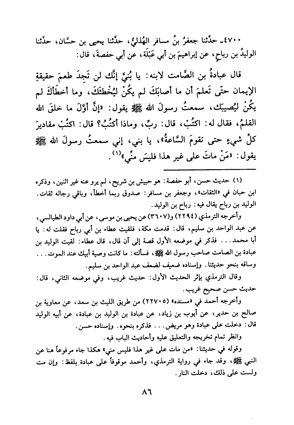 ٤٧٠٠ - حدَّثنا جعفرُ بنُ مسافر الهُذلىُّ، حدَّثنا يحيى بن حسَّان، حدَّثنا الوليدُ بن رباحٍ، عن إبراهيمَ بن أبي عَبْلَة، عن أبي حفصةَ، قال: