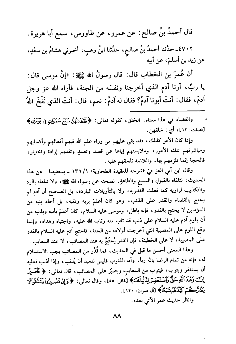 وقال ابن أبي العز فيّ "شرحه للعقيدة الطحاوية" ١/ ١٣٦ - بتحققن - عن هذا الحديث: نتلقاه بالقبولِ والسمعِ والطاعةِ، لصحته عن رسول الله -صلى الله عليه وسلم-، ولا نتلقاه بالرد والتكذيب لراويه كما فعلت القدرية، ولا بالتأويلات الباردة، بل الصحيح أن آدم لم يحتج بالقضاء والقدر على الذنب، وهو كان أعلمَ بربه وذنبه، بل آحاد بنيه من المؤمنين لا يحتج بالقدر، فإنه باطل، وموسى عليه السلام، كان أعلمَ بأبيه وبذنبه من أن يلوم آدم عليه السلام على ذنب قد تاب منه وتاب الله عليه، واجتباه وهداه، وإنما وقع اللوم على المصيبة التي أخرجت أولاده من الجنة، فاحتج آدم عليه السلام بالقدر على المصيبة، لا على الخطيئة، فإن القدر يُحتَجّ به عند المصائب، لا عند المعايب.