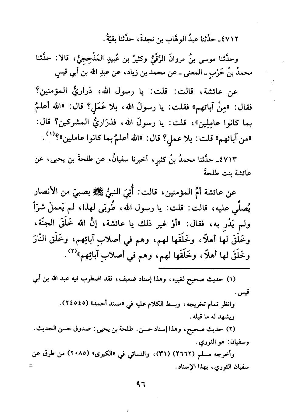 عن عائشة، قالت: قلت: يا رسول الله -صلى الله عليه وسلم-، ذرارىُّ المؤمنين؟