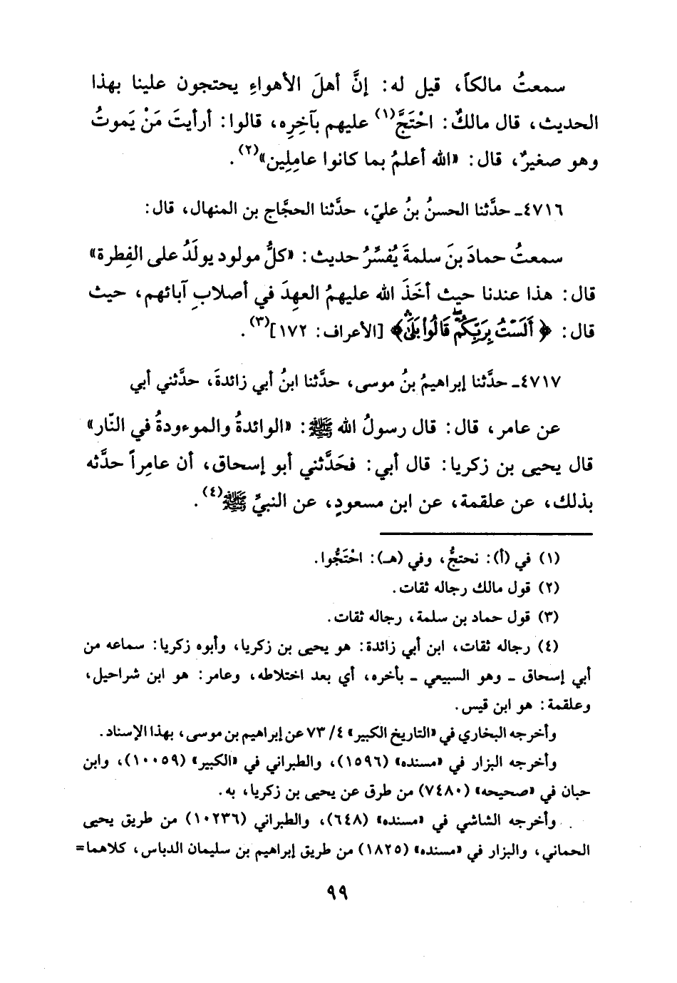 سمعتُ حمادَ بنَ سلمةَ يُفسِّرُ حديث: "كل مولود يولَدُ على الفِطرة" قال: هذا عندنا حيث أخَذَ الله عليهمُ العهِدَ في أصلابِ آبائهم، حيث قال: {أَلَسْتُ بِرَبِّكُمْ قَالُوا بَلَى} [الأعراف: ١٧٢] (¬٣).